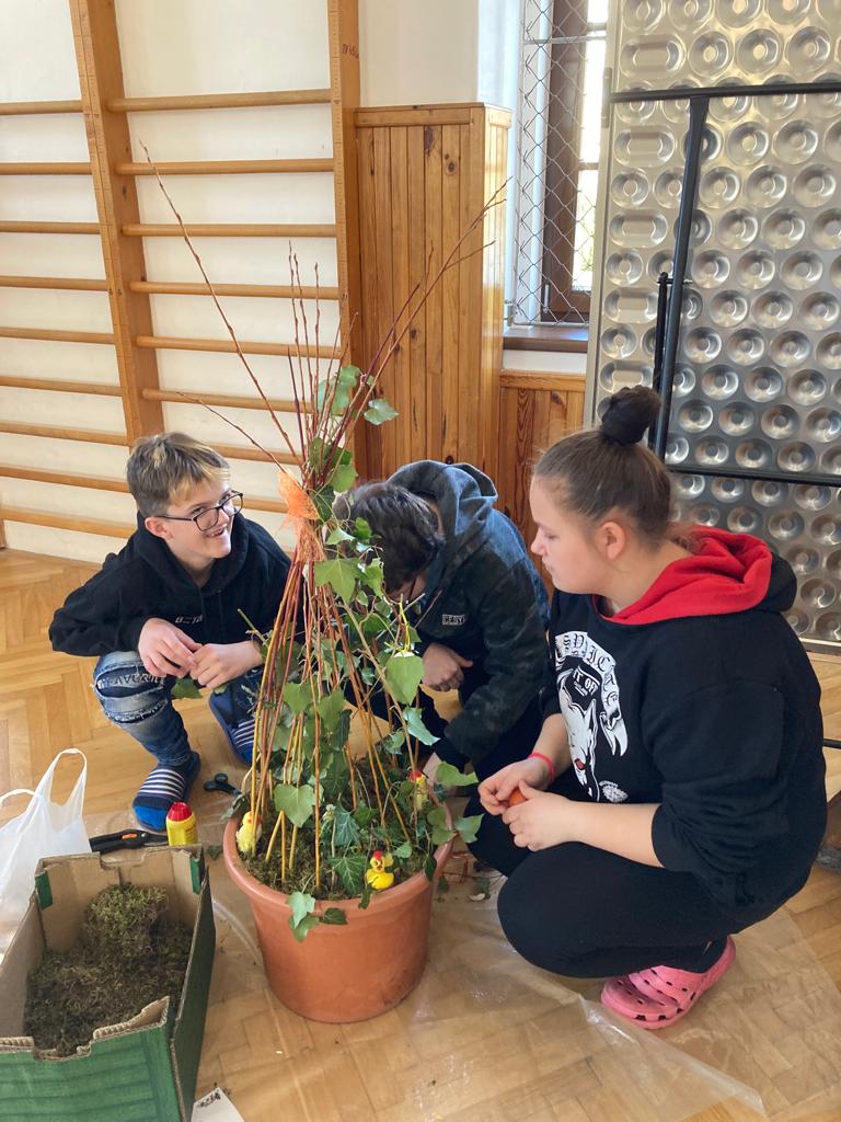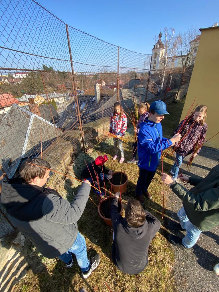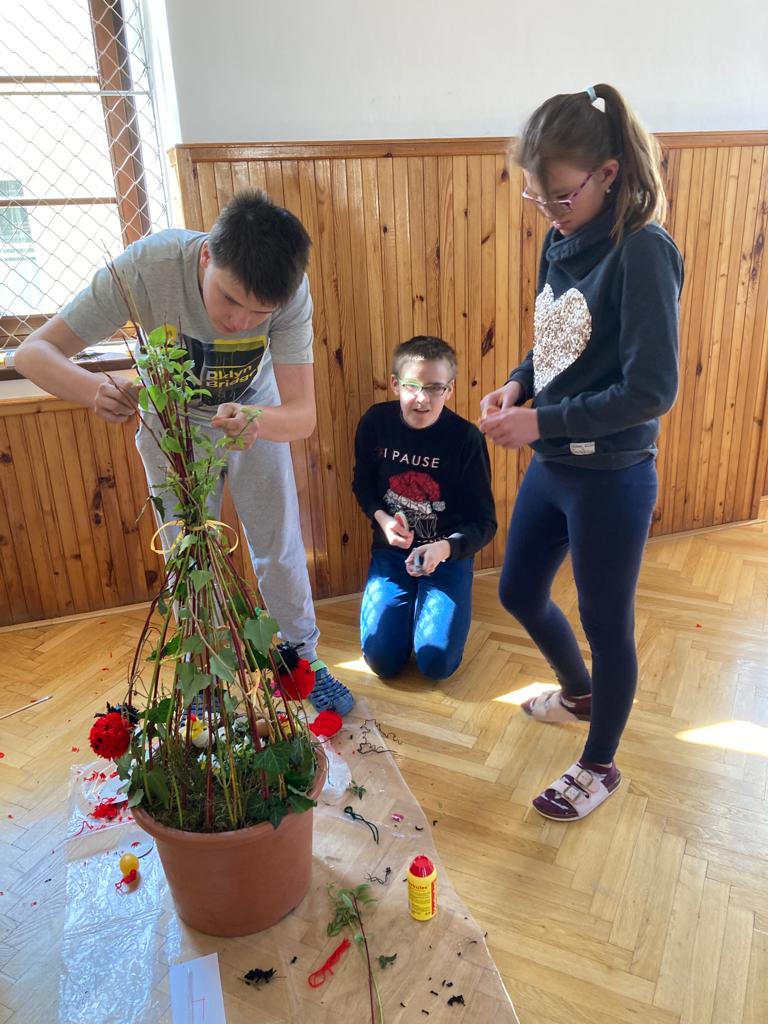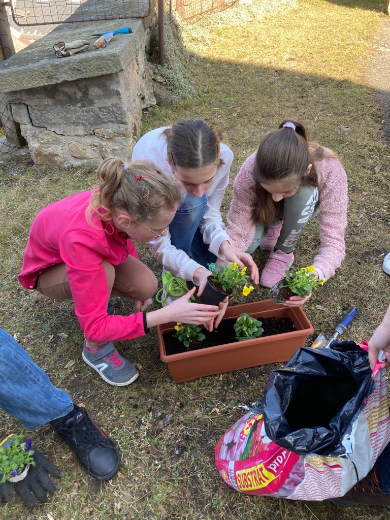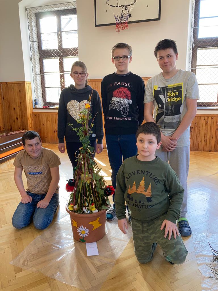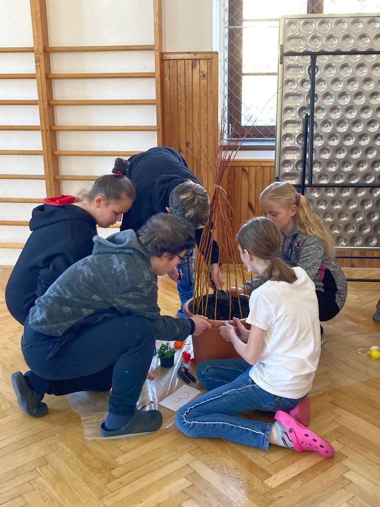 V pátek 25.března byl příjemný a fajn den. Po dlouhé době plné hygienických opatření jsme se mohli společně sejít a uspořádat projektový den. Tématem bylo jediné - vytvořit pro naší školu krásnou jarní výzdobu. Kapitáni družstva vylosovali typ výzdoby, které měli za úkol vytvořit - truhlíky na okna a velké květináče ke vchodu do školy. Žáci měli k dispozici spoustu rozmanitého materiálu - vajíčka, které si mohli ozdobit ubrouskovou technikou, různé druhy kuřátek, slepiček, všelijaké přírodní materiály, barevná lýka, mašle, různé proutí .... Zkrátka cokoli, co souvisí s jarem a blížícími se Velikonocemi. Prvním velkým úkolem bylo vsadit macešky do truhlíků a do květináčů. Sázení probíhalo venku, protože přece jen práce s hlínou do vnitřních prostorů školy nepatří. Děti vzaly osázené truhlíky a hurá do tělocvičny, která se proměnila v aranžerskou dílnu. Žáci pracovali s velkým zaujetím, úžasně spolupracovali, pomáhali si. Během necelých dvou hodin dokázali vytvořit nádhernou výzdobu, která naši školu rozzářila.