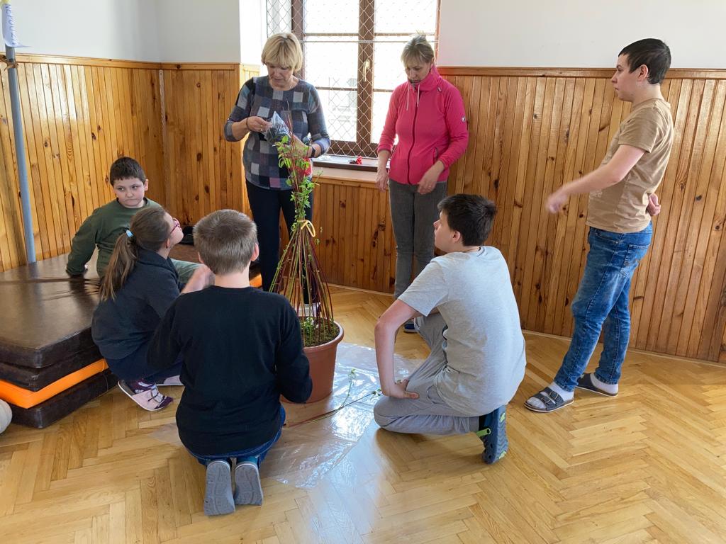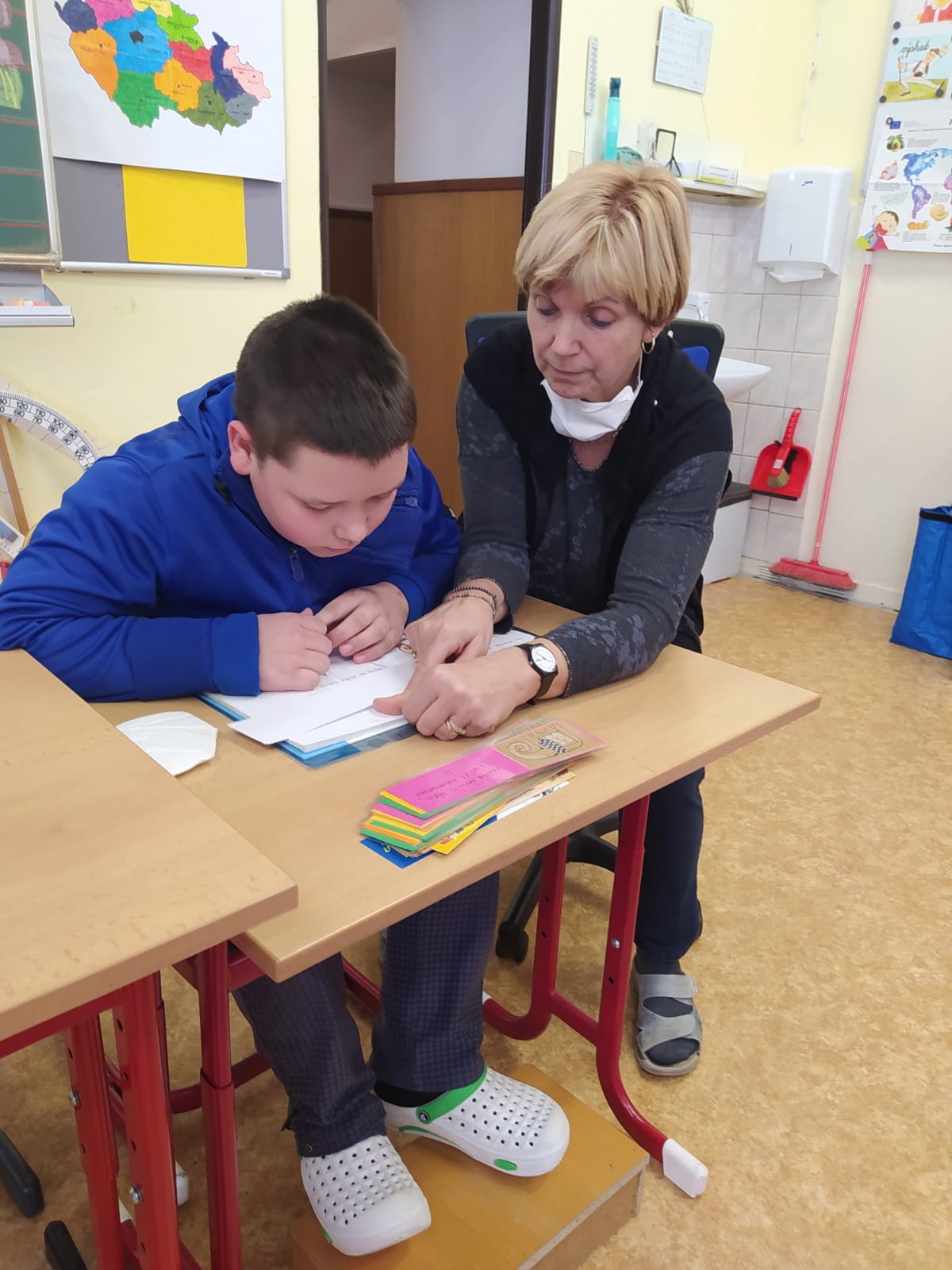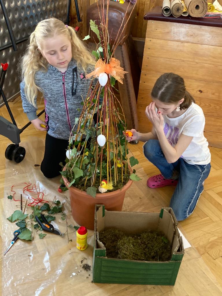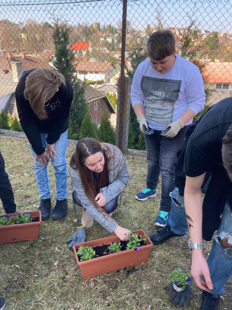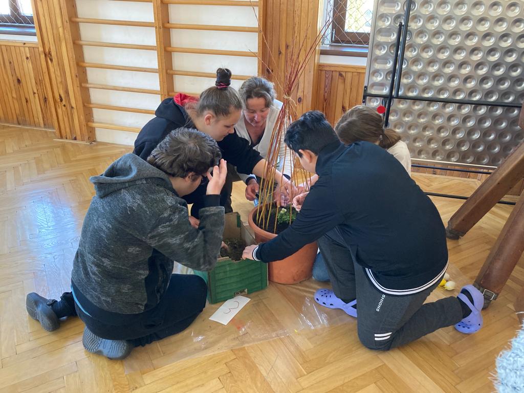 V pátek 25.března byl příjemný a fajn den. Po dlouhé době plné hygienických opatření jsme se mohli společně sejít a uspořádat projektový den. Tématem bylo jediné - vytvořit pro naší školu krásnou jarní výzdobu. Kapitáni družstva vylosovali typ výzdoby, které měli za úkol vytvořit - truhlíky na okna a velké květináče ke vchodu do školy. Žáci měli k dispozici spoustu rozmanitého materiálu - vajíčka, které si mohli ozdobit ubrouskovou technikou, různé druhy kuřátek, slepiček, všelijaké přírodní materiály, barevná lýka, mašle, různé proutí .... Zkrátka cokoli, co souvisí s jarem a blížícími se Velikonocemi. Prvním velkým úkolem bylo vsadit macešky do truhlíků a do květináčů. Sázení probíhalo venku, protože přece jen práce s hlínou do vnitřních prostorů školy nepatří. Děti vzaly osázené truhlíky a hurá do tělocvičny, která se proměnila v aranžerskou dílnu. Žáci pracovali s velkým zaujetím, úžasně spolupracovali, pomáhali si. Během necelých dvou hodin dokázali vytvořit nádhernou výzdobu, která naši školu rozzářila.