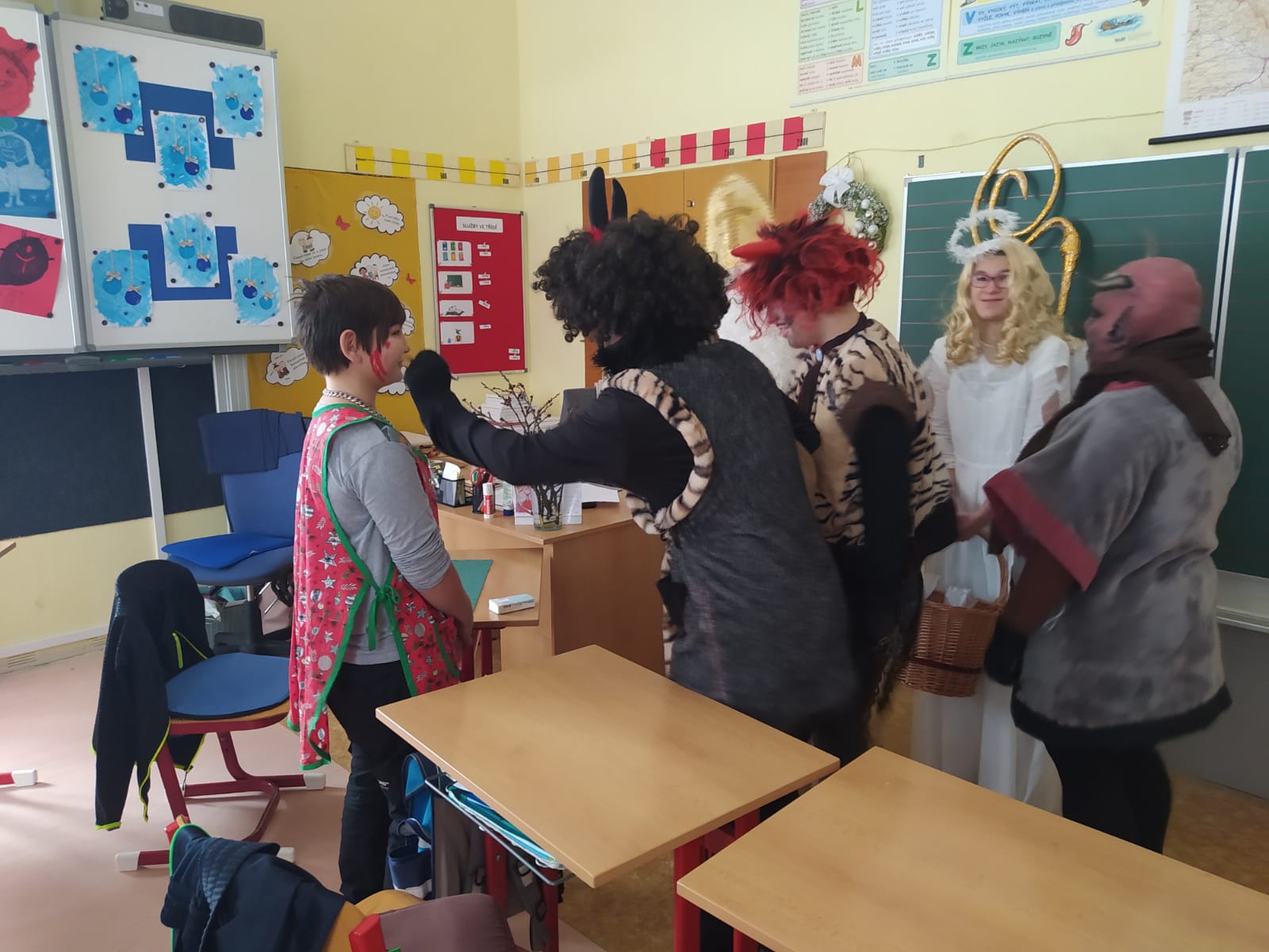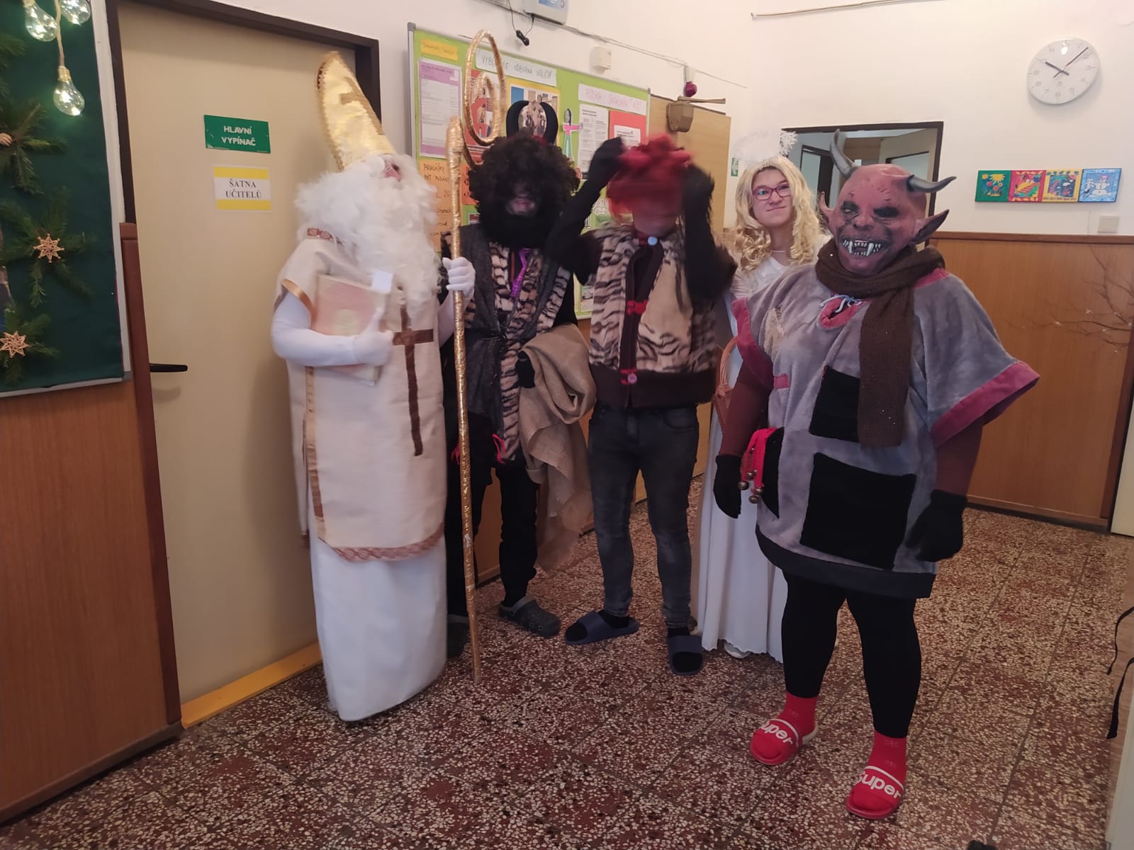 Stejně jako vloni navštívili naší školu čerti, anděl a Mikuláš. Vzali to hezky od podlahy, s ničím se nepárali. Byli hroziví, řinčeli řetězy, už už některé brali do pytle. Naštěstí se děti vykoupily pomocí písničky či básničky, některé slibovaly hory doly. No, uvidíme, zda-li se hříšníci do příštího roku polepší....