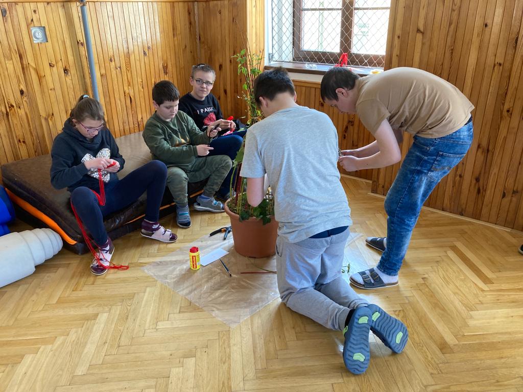 V pátek 25.března byl příjemný a fajn den. Po dlouhé době plné hygienických opatření jsme se mohli společně sejít a uspořádat projektový den. Tématem bylo jediné - vytvořit pro naší školu krásnou jarní výzdobu. Kapitáni družstva vylosovali typ výzdoby, které měli za úkol vytvořit - truhlíky na okna a velké květináče ke vchodu do školy. Žáci měli k dispozici spoustu rozmanitého materiálu - vajíčka, které si mohli ozdobit ubrouskovou technikou, různé druhy kuřátek, slepiček, všelijaké přírodní materiály, barevná lýka, mašle, různé proutí .... Zkrátka cokoli, co souvisí s jarem a blížícími se Velikonocemi. Prvním velkým úkolem bylo vsadit macešky do truhlíků a do květináčů. Sázení probíhalo venku, protože přece jen práce s hlínou do vnitřních prostorů školy nepatří. Děti vzaly osázené truhlíky a hurá do tělocvičny, která se proměnila v aranžerskou dílnu. Žáci pracovali s velkým zaujetím, úžasně spolupracovali, pomáhali si. Během necelých dvou hodin dokázali vytvořit nádhernou výzdobu, která naši školu rozzářila.
