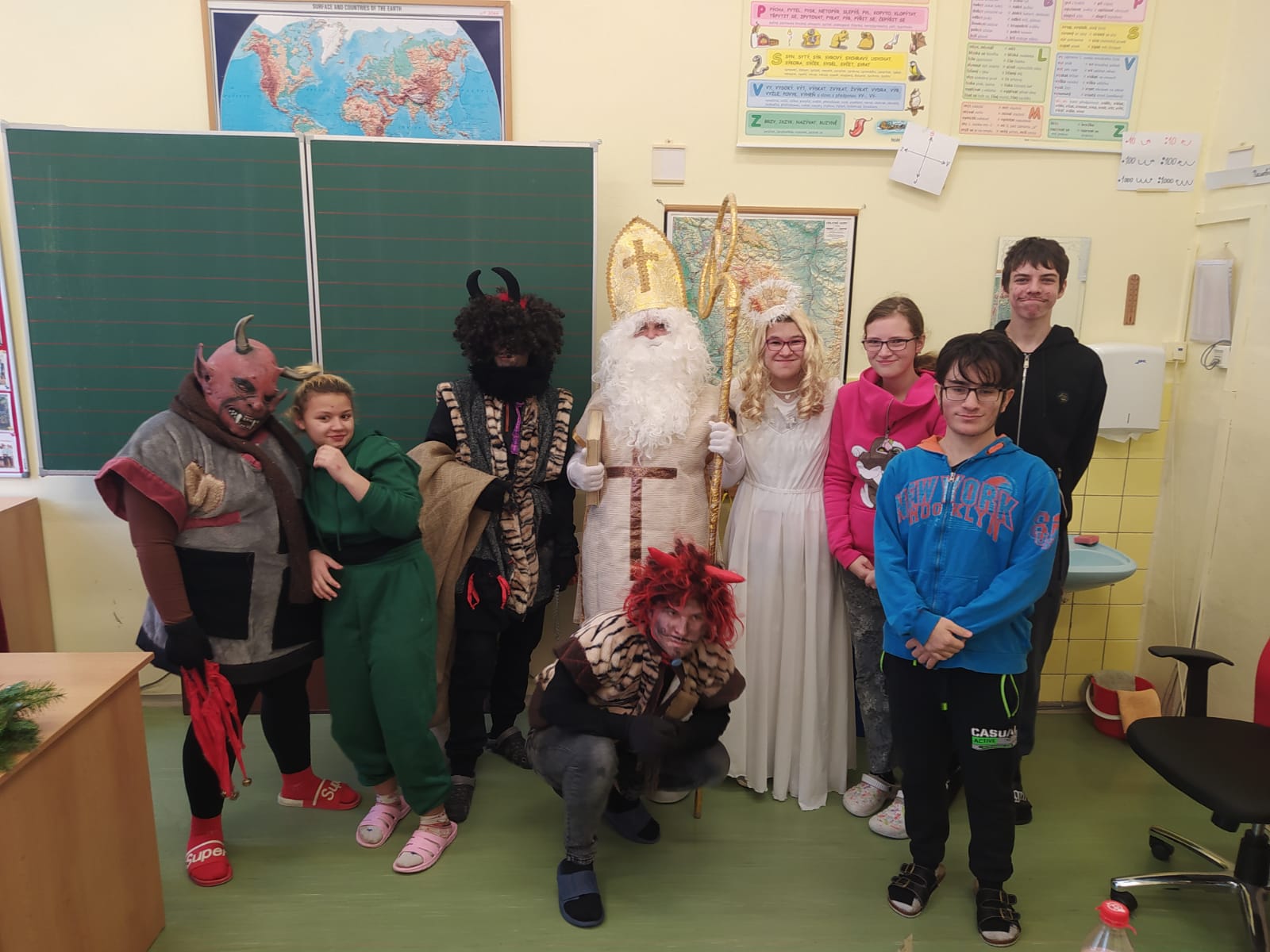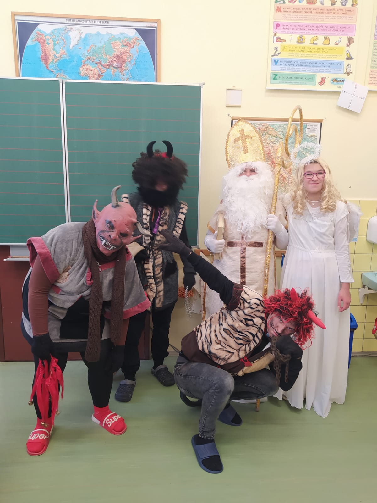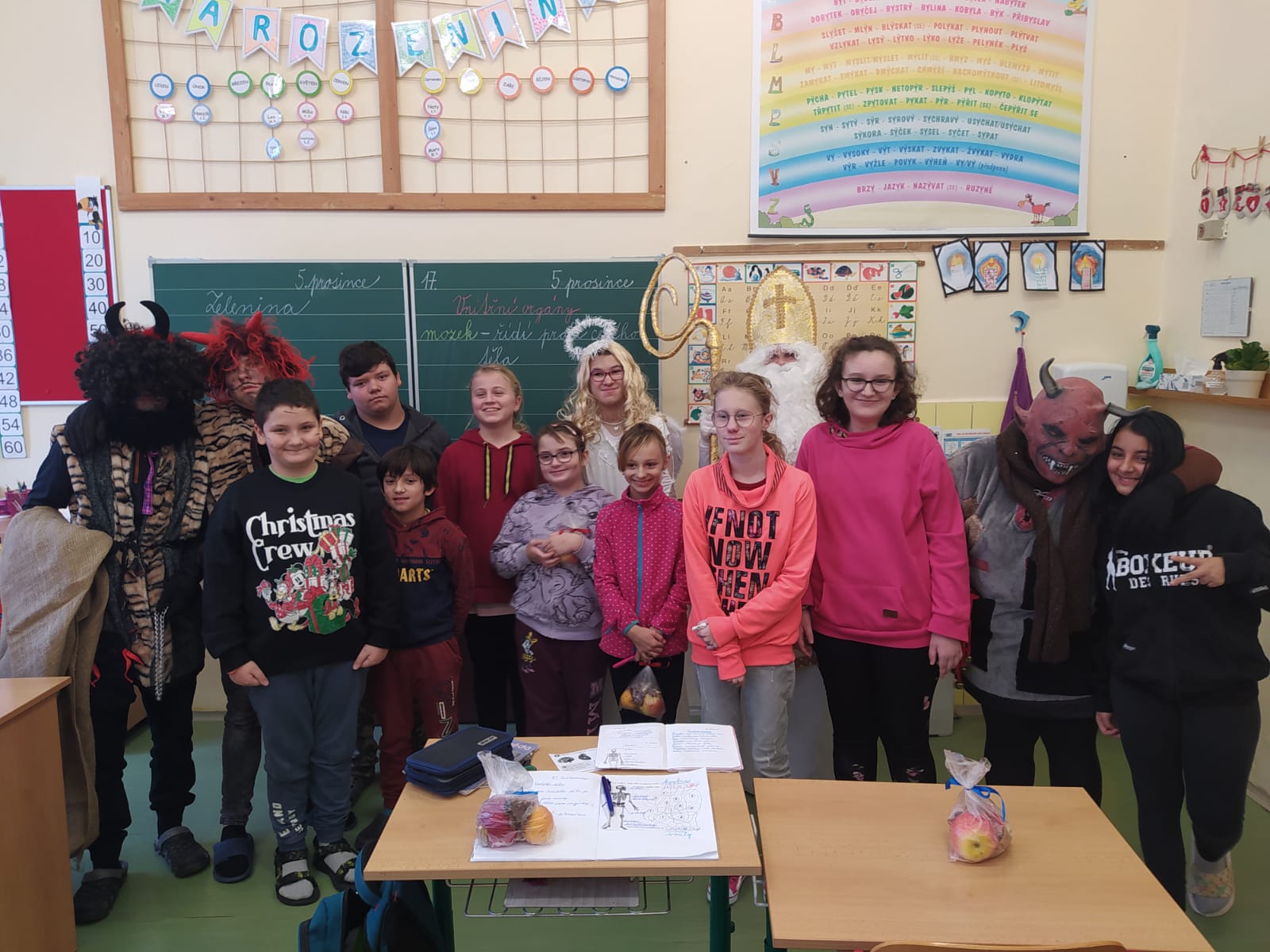 Stejně jako vloni navštívili naší školu čerti, anděl a Mikuláš. Vzali to hezky od podlahy, s ničím se nepárali. Byli hroziví, řinčeli řetězy, už už některé brali do pytle. Naštěstí se děti vykoupily pomocí písničky či básničky, některé slibovaly hory doly. No, uvidíme, zda-li se hříšníci do příštího roku polepší....